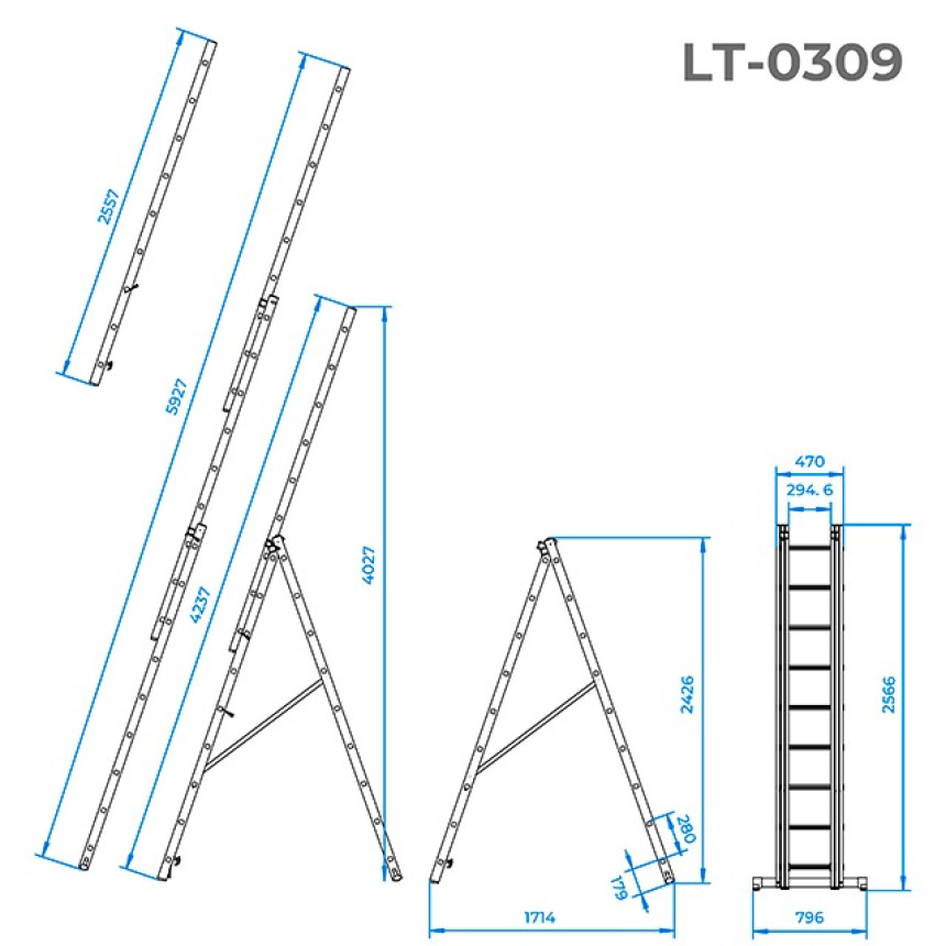 Алюмінієві сходи LT-0309 виготовлені з надміцного, легкого, стійкого до корозії алюмінієвого профілю. Сходи стійкі та не ковзають по будь-яких поверхнях, завдяки надійним пластиковим ніжкам, вони також захищають меблі й підлогу від вм'ятин та подряпин. Рифлені сходинки не дадуть нозі зіслизнути під час роботи. Модель розрахована на тривалий термін експлуатації та відповідає європейському стандарту якості EN 131.