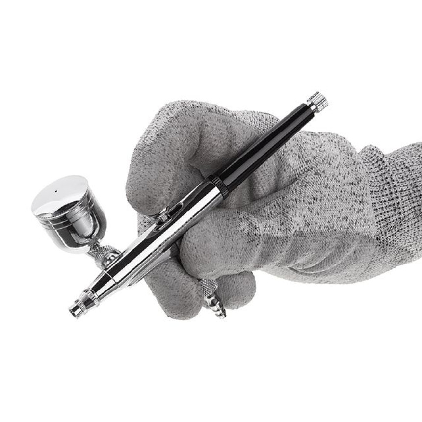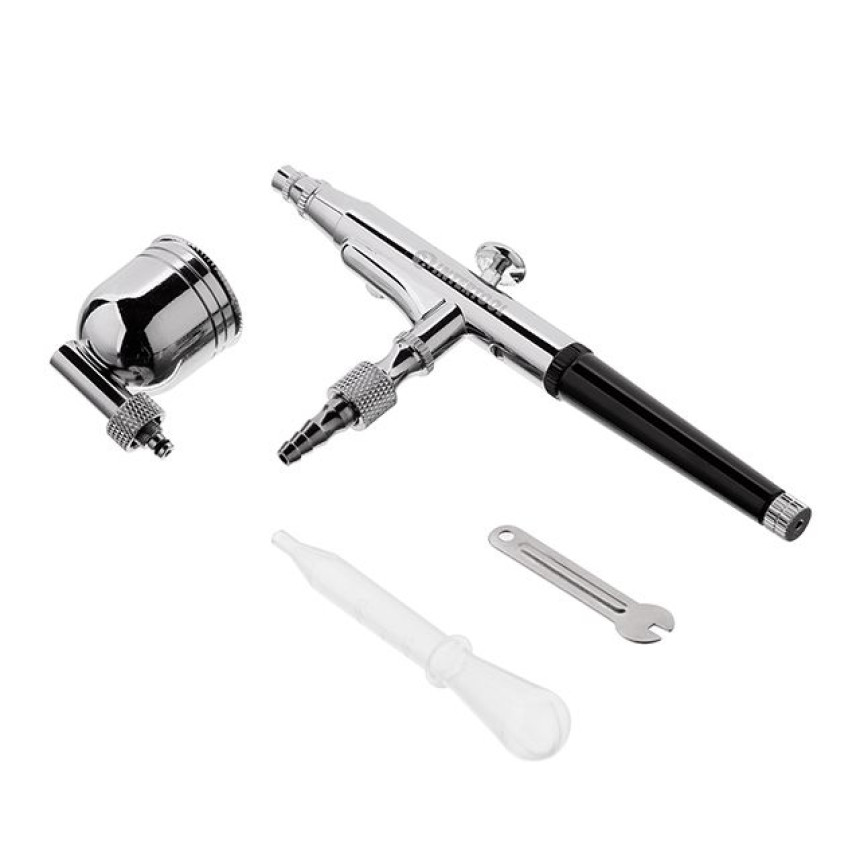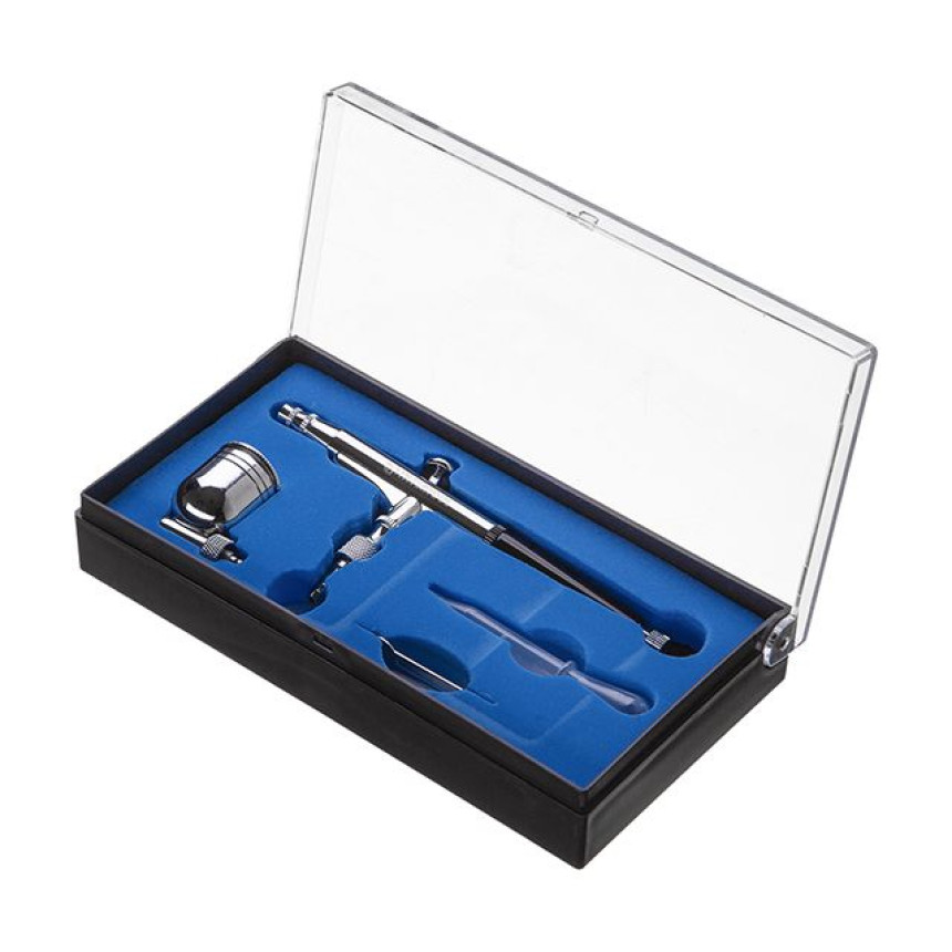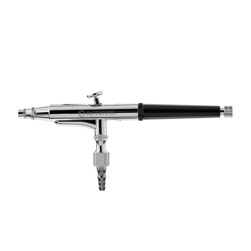 Міні аерограф з набором аксесуарів INTERTOOL PT-1504 застосовується для нанесення промислової графіки, ілюстрацій, ретушування фотографій та т. п. Аерограф має робочий тиск 1-3,5 атм, витрату повітря до 50 л/хв. Діаметр форсунки складає 0,3 мм. До комплекту входять: бачок об'ємом 7 мл, піпетка-дозатор, ключ для форсунки та пластиковий футляр. Корпус та бачок виготовлені з металу.