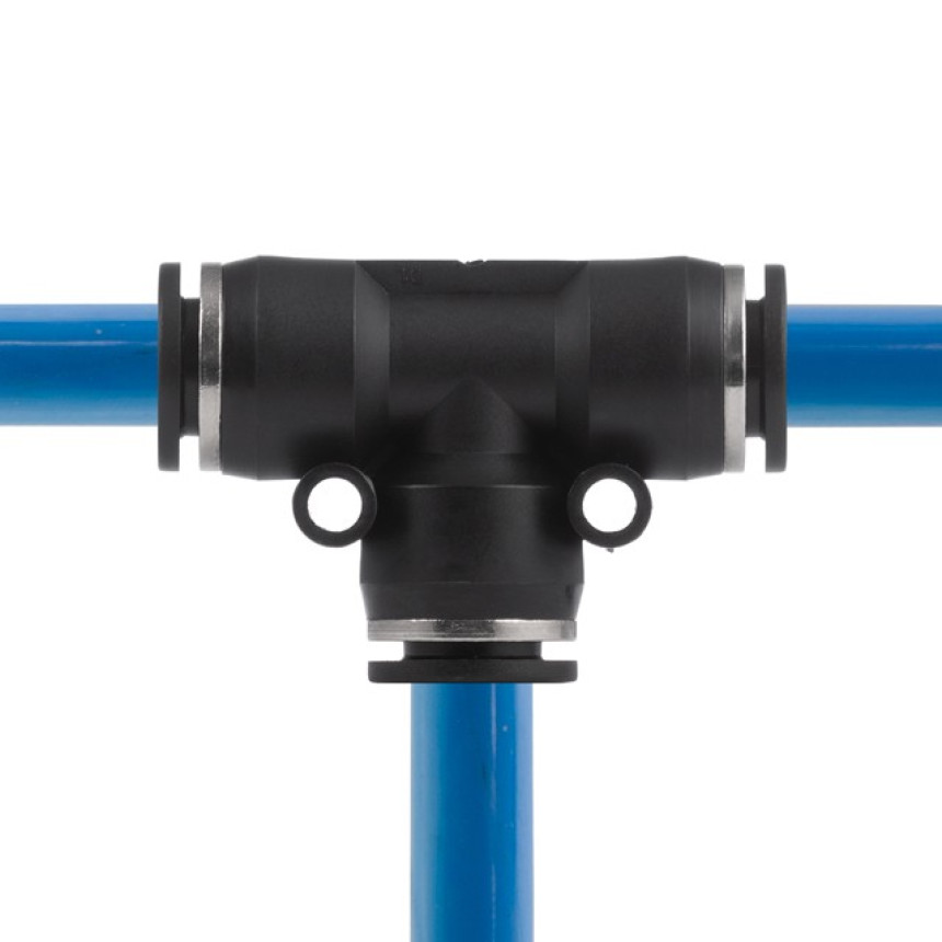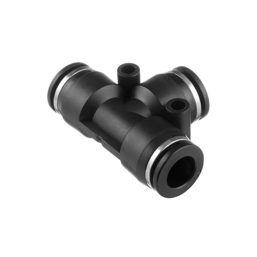 Цангове з'єднання T-подібної форми використовується для створення пневматичних магістралей і для монтажу пневмосистем. Забезпечує повністю герметичне з'єднання різних пневматичних шлангів без пошкодження їхньої поверхні (PU, PE, PA) - поліуретанових, поліетиленових, поліамідних тощо.