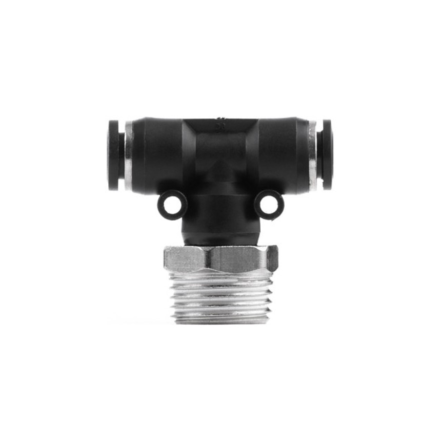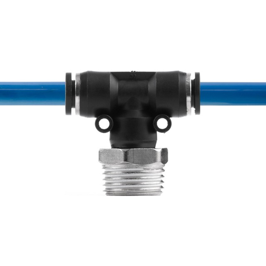 Цангове з'єднання T-подібної форми використовується для створення пневматичних магістралей і для монтажу пневмосистем. Забезпечує повністю герметичне з'єднання різних пневматичних шлангів без пошкодження їхньої поверхні (PU, PE, PA) - поліуретанових, поліетиленових, поліамідних тощо.