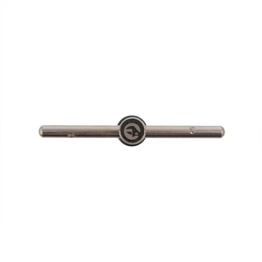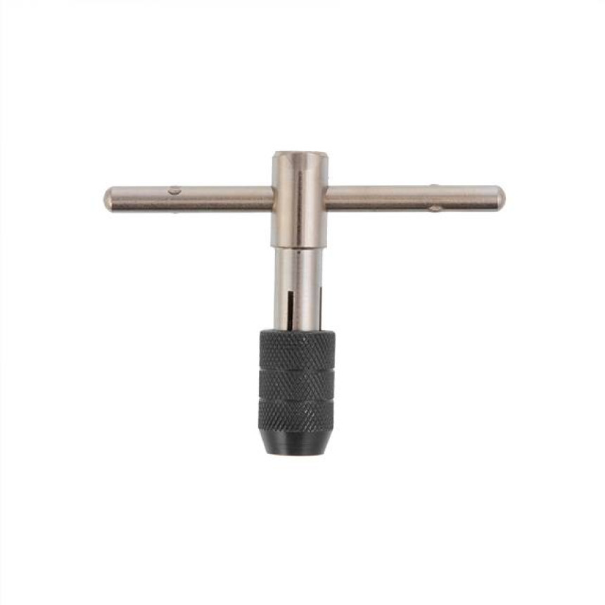 Тримач досить простої конструкції з хромованим покриттям. Т-подібна ручка працює як важіль і дозволяє докладати більше зусиль, вона може зніматися для компактного зберігання інструмента. Затискна частина розсувається для надійного фіксування мітчиків у патроні. Затискна втулка має насічки для зручної роботи.