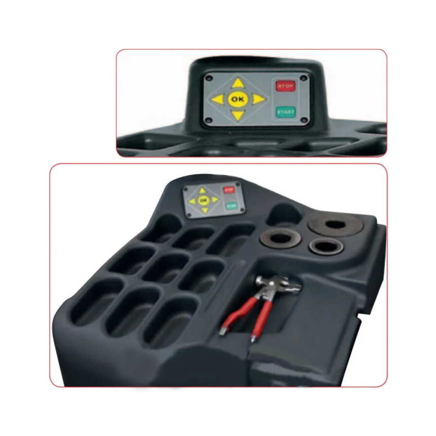 PREMIUM модель із інтелектуальним приводом. Відрізняється надійністю, зручністю та простотою експлуатації. Інформативний LCD монітор з 3D графікою позиціонує Вас справжнім експертом у галузі шиномонтажу. Оснащений зовнішнім та внутрішнім автоматичними важелями автоматичне введення діаметра, дистанції та ширини диска. Має можливість до 3 операторів без повторного введення параметрів. Автоматично вимірює діаметр та відстань до передбачуваного місця кріплення грузика та автоматично фіксує вимірювальний пристрій при досягненні ним необхідної позиції функція ALUDATA. Оснащений режимами самокалібрування та самоконтролю, функціями розподілу вантажу за спицями диска та автоматичного запуску при опусканні захисного кожуха. Педаль гальма ножа дозволяє надійно зафіксувати колесо в точці кріплення вантажу.Програми: Стандартна динамічна; 5 програм ALU; 3 статичні програми для легкових та мото коліс для встановлення самоклеючих вантажів - за допомогою "ALUDATA" ; 2 програми для РАХ коліс; програма поділу вантажу; програма оптимізації; Технічні характеристики: Максимальний діаметр колеса мм 1120 Максимальний діаметр колеса дюйми 44 Діаметр диска дюйми 8-30 Ширина диска дюйми 2-20 Максимальна вага колеса кг 70 Частота обертання шпинделя об/хв 167 Електроживлення В/Гц 220/50-60 Потужність кВт 0,35