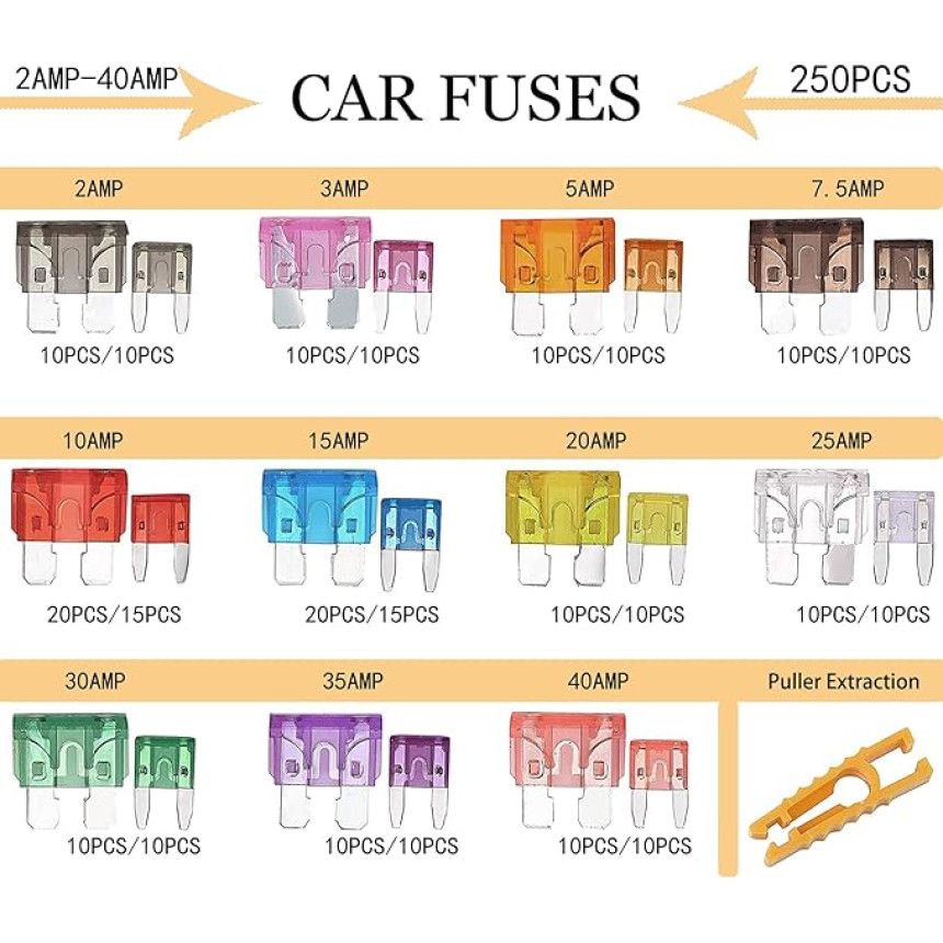 Этот комплект включает в себя 130 стандартных предохранителей и 120 мини-предохранителей с прозрачным корпусом для быстрой замены и проверки. Предохранители изготовлены из высококачественного цинкового сплава и пластика, а удобный кейс из ПВХ обеспечивает простоту хранения и транспортировки.