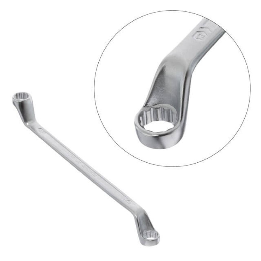 Дві накидні частини з дванадцятьма гранями збільшують площу прилягання поверхонь і знижують ризик зриву граней гайок та болтів. Робочі отвори розміщені під кутом до поверхонь, завдяки чому рука не зачіпляється та вільно обертає ключ.