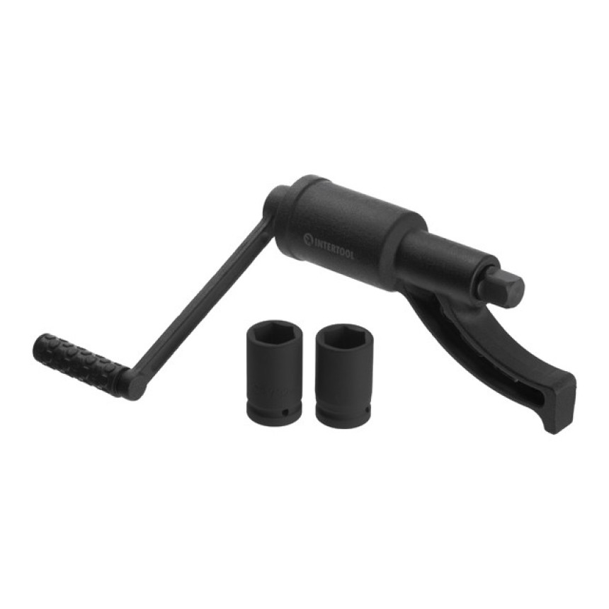 Перед початком роботи необхідно встановити ручку та обрати торцеву головку відповідного розміру. Для більш комфортної та ефективної роботи з ключем передбачена спеціальна ніжка, яка упирається в диск, забезпечуючи стабільне положення. Ручка має текстуроване покриття зі спіненого каучуку для кращої фіксації в руці.