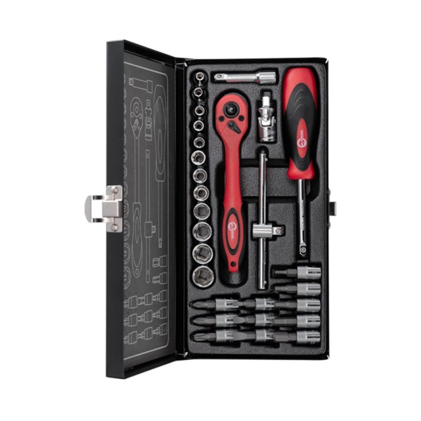 Основою комплекту стала тріскачка з приводом 1/4", шестигранні головки для виконання різнопланових робіт на закручування та відкручування кріплень. А наявність подовжувача, воротка та кардана полегшить роботу у важкодоступних місцях. Різноманітні головки-біти (HEX, PH, SL) знадобляться для роботи з різними видами шліців, які використовують у меблевій промисловості, будівництві, машинобудуванні тощо.