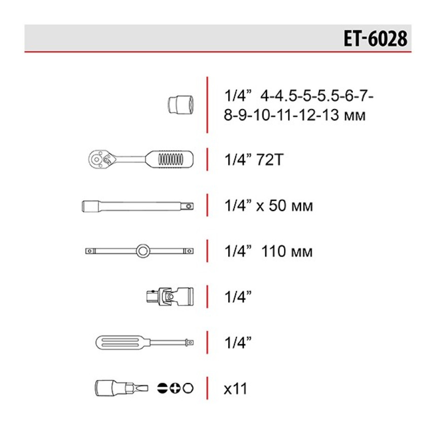 Головка шестигранна торцева 1/4", 12 од.: 4, 4.5, 5, 5.5, 6, 7, 8, 9, 10, 11, 12, 13 мм;