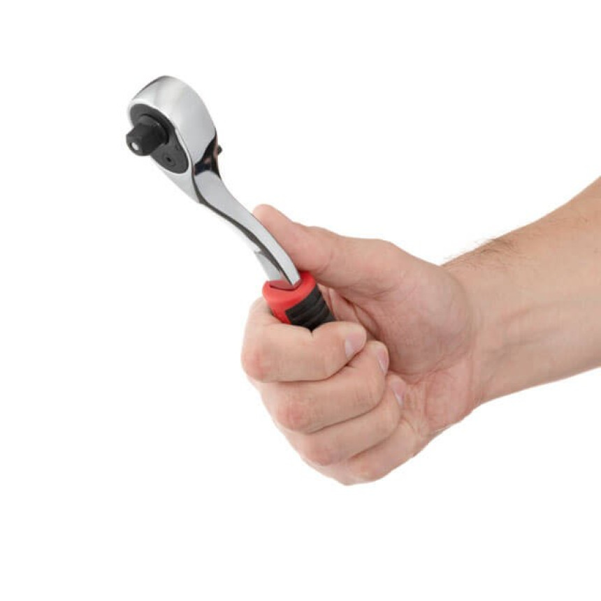 Основою комплекту є тріскачка з посадковим квадратом 3/8”, з перемикачем напрямку та кнопкою для скидання-фіксації головок. Її вигнута форма дозволяє працювати з незручно розташованими кріпленнями.