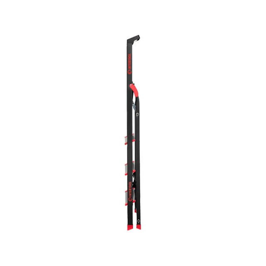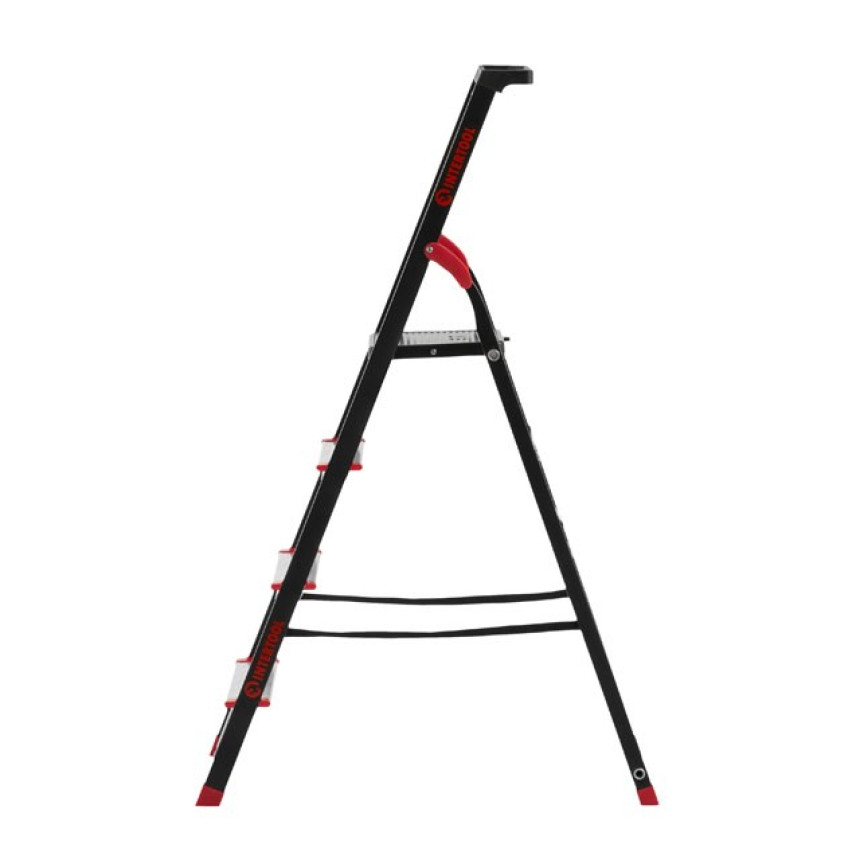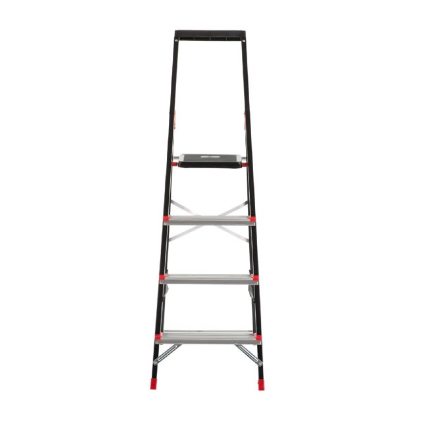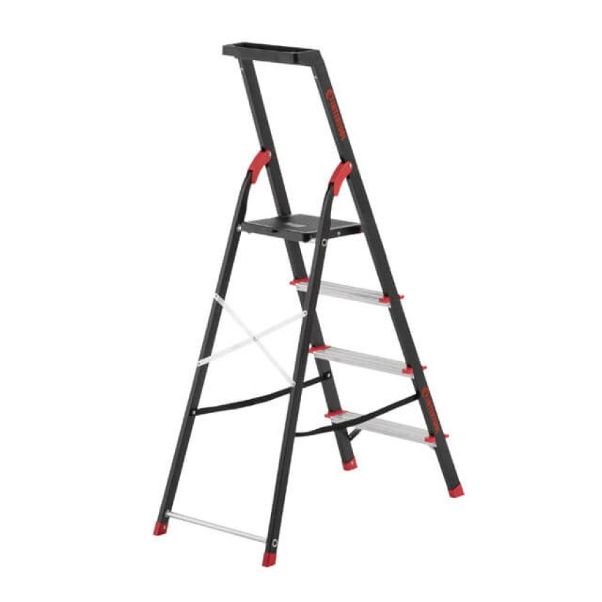 Драбина визготовлена з міцного сталевого профілю з алюмінієвими сходинками. Рифлені сходинки не дадуть зісковзнути нозі і забезпечать безпечний підйом, а також зручне положення під час роботи. Драбина відповідає європейському стандарту EN131 і витримує навантаження до 150 кг.