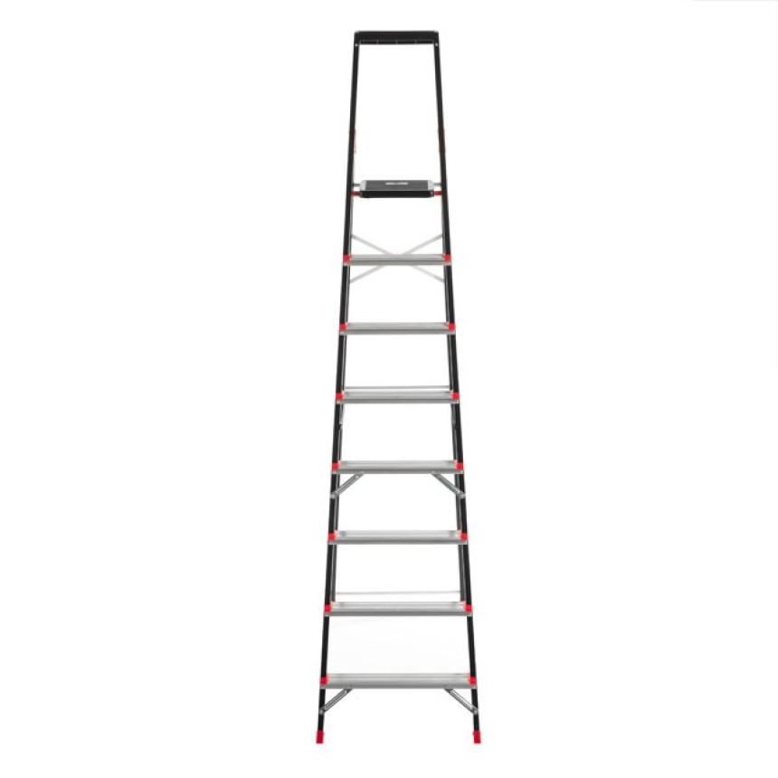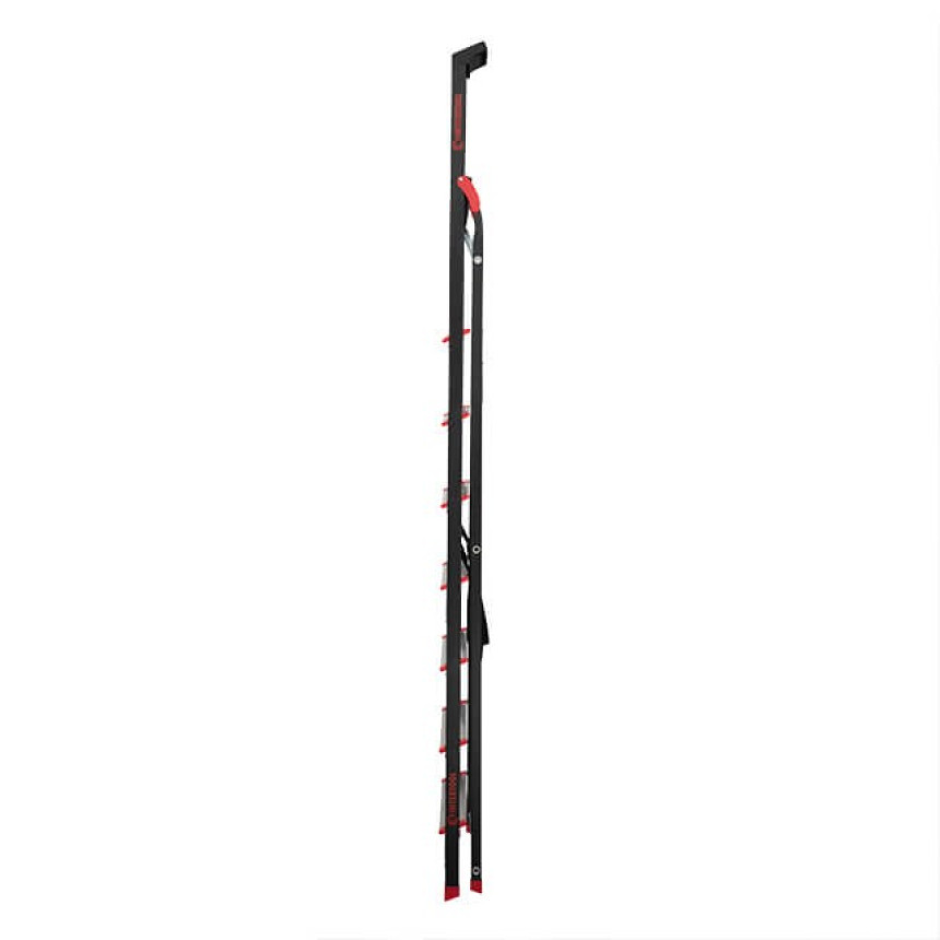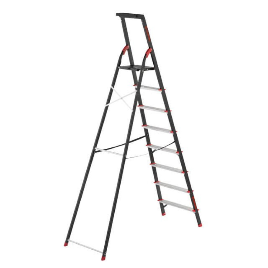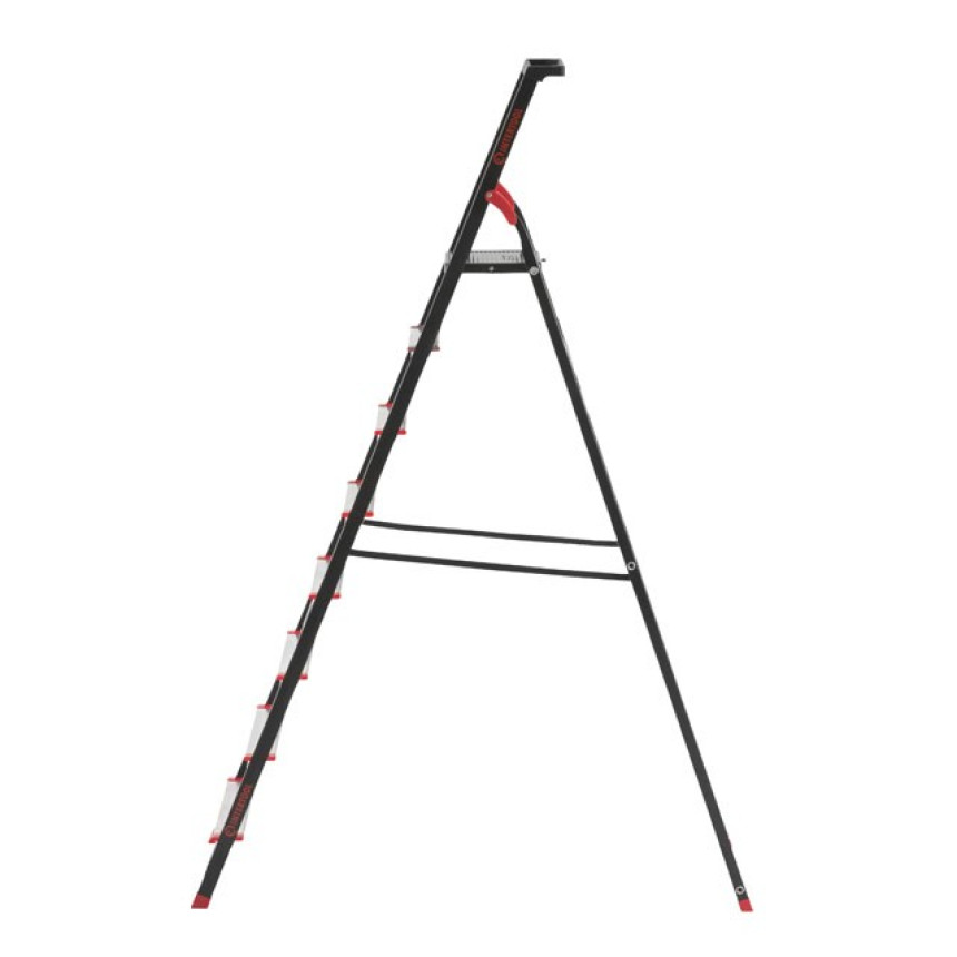 Драбина визготовлена з міцного сталевого профілю з алюмінієвими сходинками. Рифлені сходинки не дадуть зісковзнути нозі і забезпечать безпечний підйом, а також зручне положення під час роботи. Драбина відповідає європейському стандарту EN131 і витримує навантаження до 150 кг.