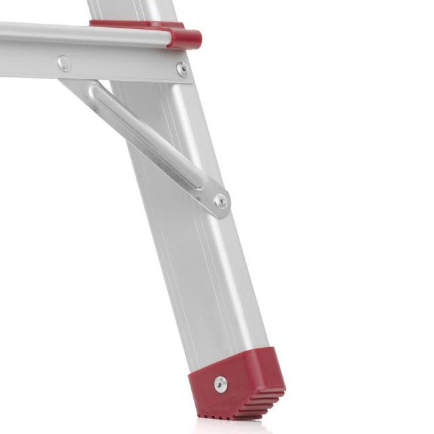 Протиковзні опорні наконечники міцно зчіплюються з поверхнями підлоги. Драбина стійко стоїть і ви не боїтеся впасти. А надійні шарніри та стяжні профілі безпеки з боків, захищають від непередбаченого складання та розкладання драбини.
