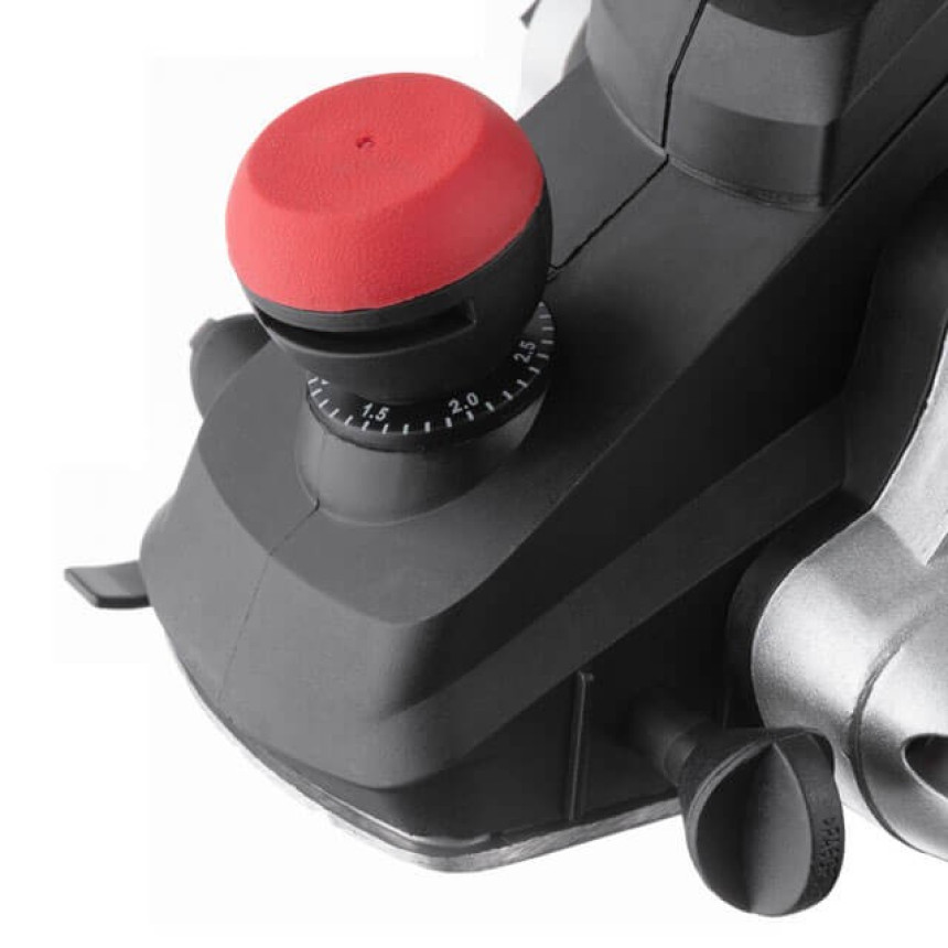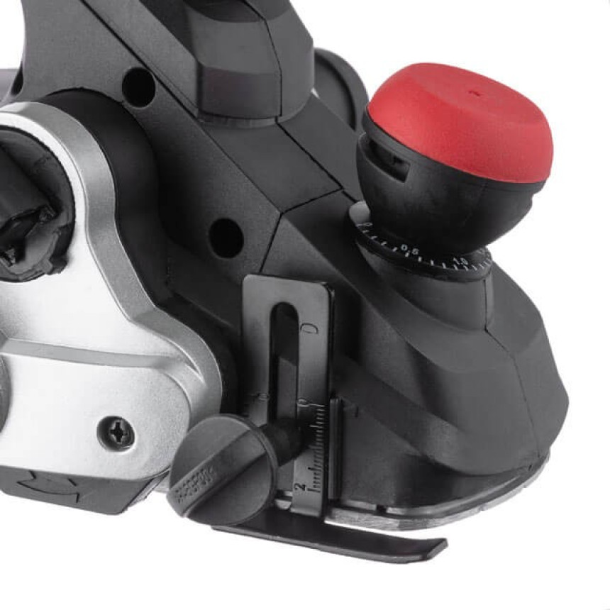 Потужність двигуна 850 Вт розвиває швидкість обертання ножів до 16000 об/хв., що дозволяє ефективно знімати матеріал з максимальною глибиною 3 мм та шириною 82 мм. Плавне регулювання глибини стругання дозволяє підібрати оптимальну глибину зрізу – крок становить всього 0,1 мм.