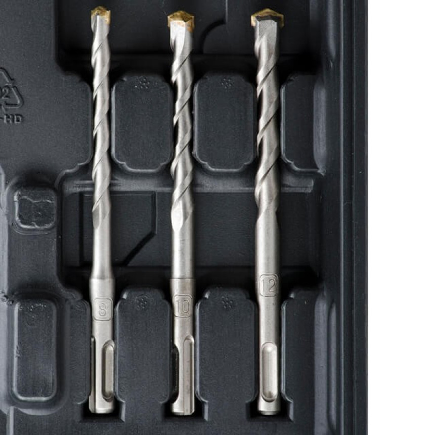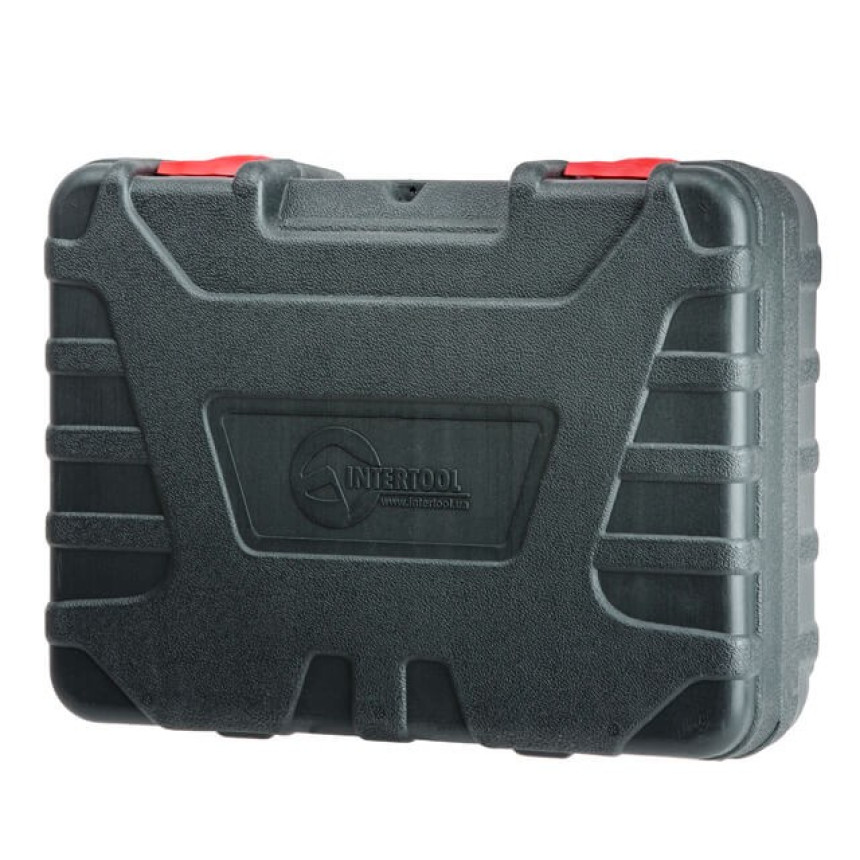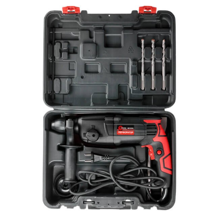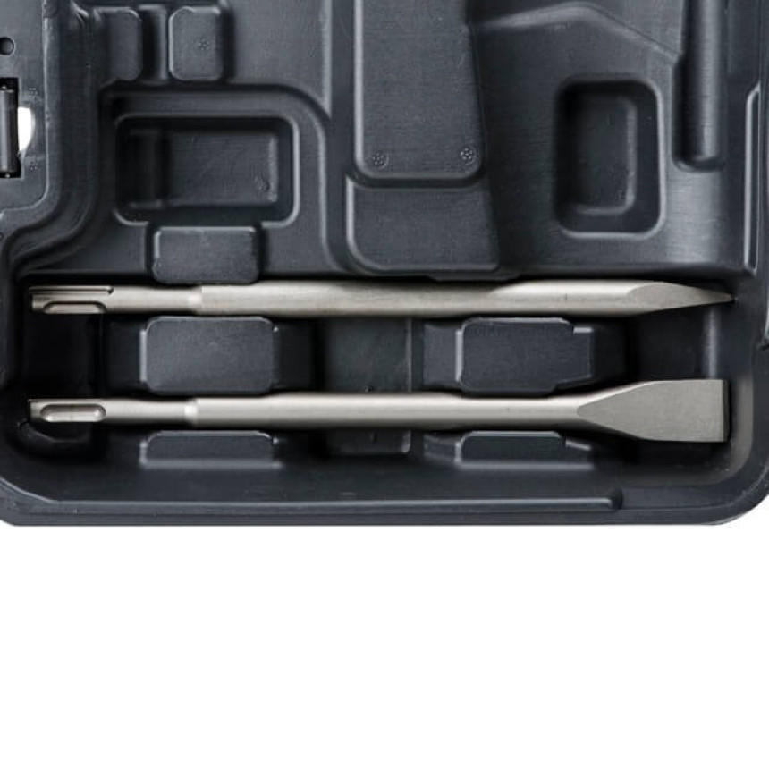 Перфоратор та всі елементи комплекту запаковані у надійний кейс зі зручною ручкою для транспортування та зберігання.