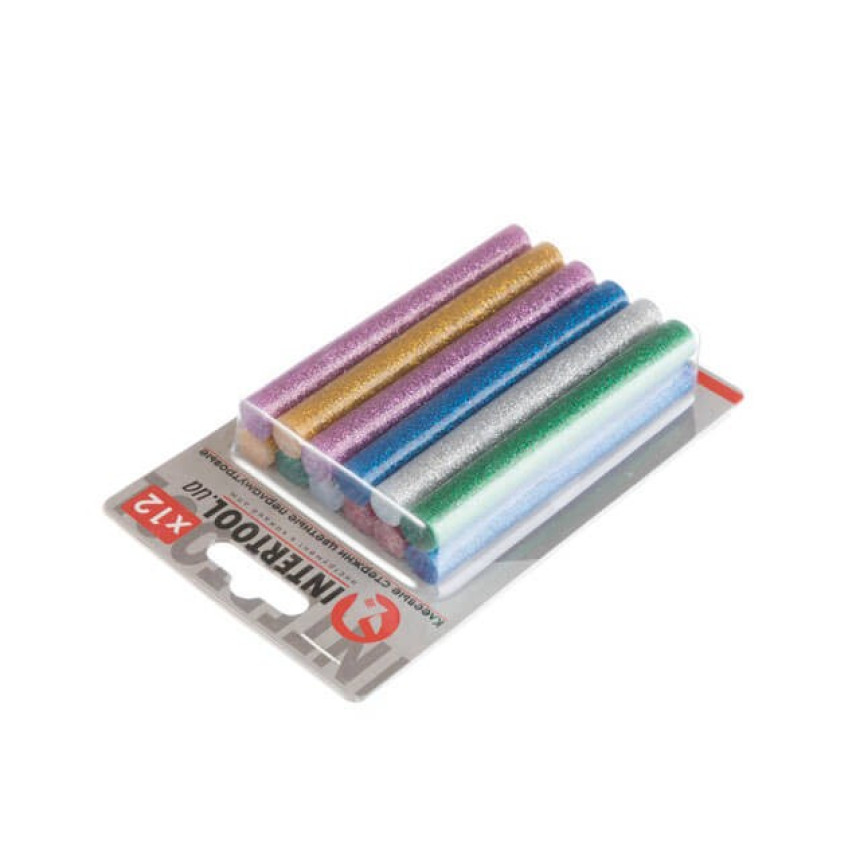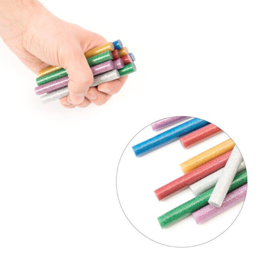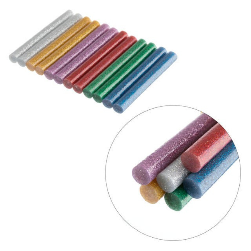 Кольорові клейові стержні з блискітками, в комплекті 6 кольорів: срібло, золото, червоний, бузковий, зелений, синій. Діаметр стрижня 11,2 мм - один із найпоширеніших і найпопулярніших розмірів, підходить до будь-яких марок клейових пістолетів. Сам стрижень довжиною 100 мм, в упаковці 12 штук.