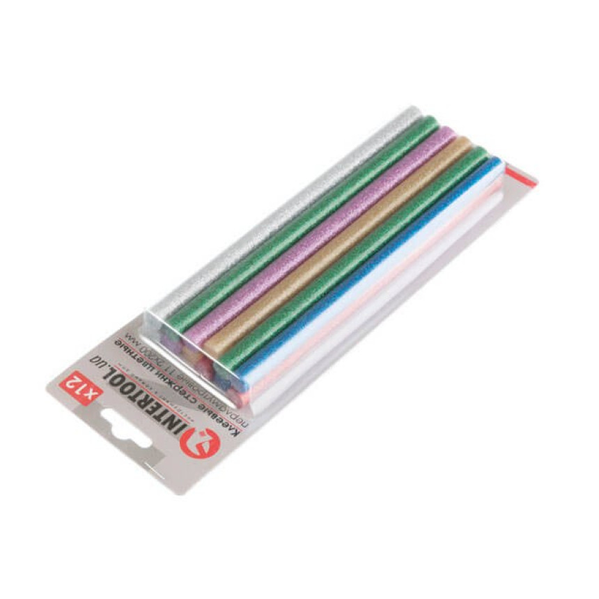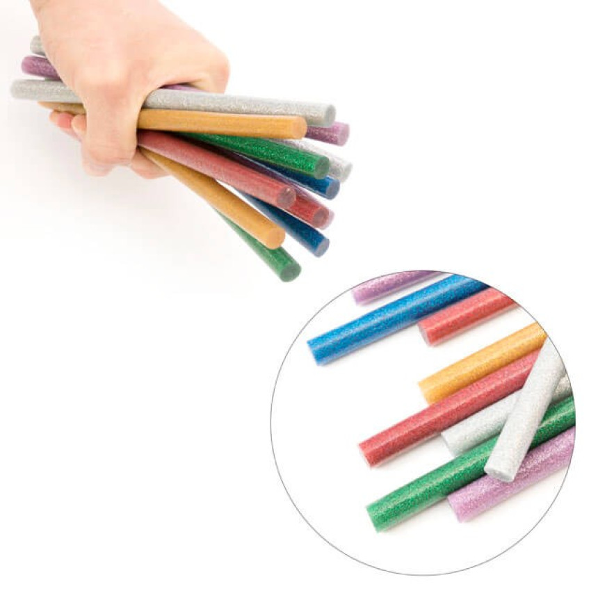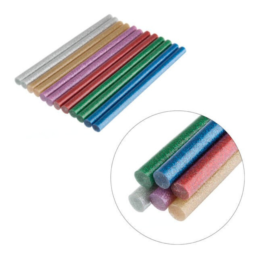 Кольорові клейові стержні з блискітками, в комплекті 6 кольорів: срібло, золото, червоний, бузковий, зелений, синій. Діаметр стрижня 7,4 мм - один із найпоширеніших і найпопулярніших розмірів, підходить до будь-яких марок клейових пістолетів. Сам стрижень довжиною 200 мм, в упаковці 12 штук.