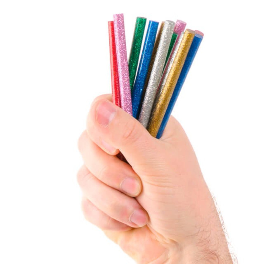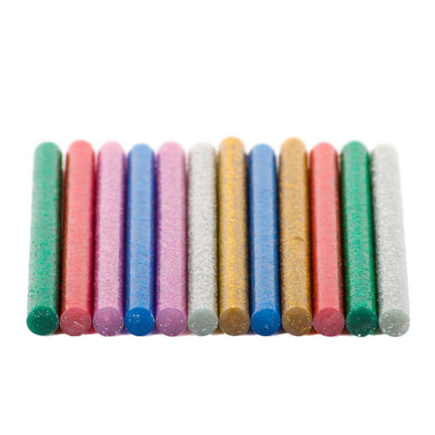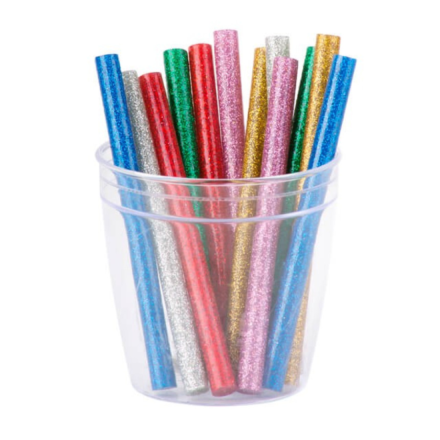 Кольорові клейові стержні з блискітками, в комплекті 6 кольорів: срібло, золото, червоний, бузковий, зелений, синій. Діаметр стрижня 7,4 мм - один із найпоширеніших і найпопулярніших розмірів, підходить до будь-яких марок клейових пістолетів. Сам стрижень довжиною 100 мм, в упаковці 12 штук.