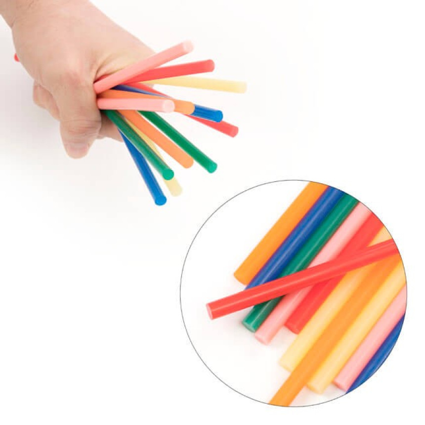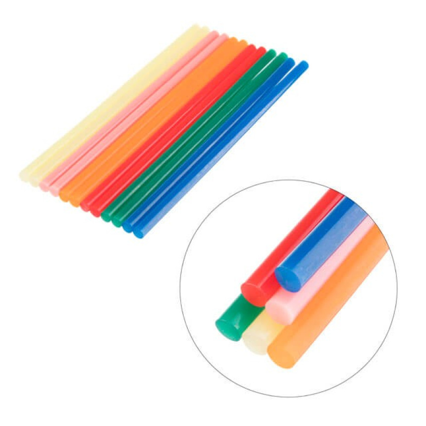 Клейові стрижні різних кольорів універсальні, підходять для різних завдань. Термоклей кольоровий: синій, зелений, оранжевий, червоний, жовтий, рожевий. В упаковці по 2 стержні кожного з кольорів. Діаметр стрижня 11,2 мм - один із найпоширеніших і найпопулярніших розмірів, підходить до будь-яких марок клейових пістолетів. Сам стрижень довжиною 200 мм, в упаковці 12 штук.