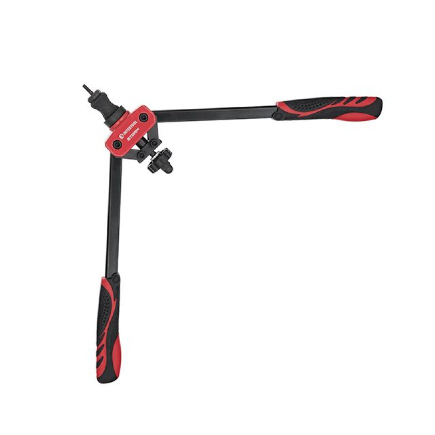 Повністю прогумовані рукоятки з рифленим нанесенням забезпечують надійне захоплення інструмента і протистоять зісковзуванню навіть забруднених рук. Замінити насадки не становитиме особливих труднощів за рахунок простої конструкції фіксатора зі штифтом. При цьому дістати заклепник із забитої нітогайки допоможе спеціальний гвинт з "баранцем", який знаходиться між рукояток, відкрутивши його Ви легко звільните інструмент.