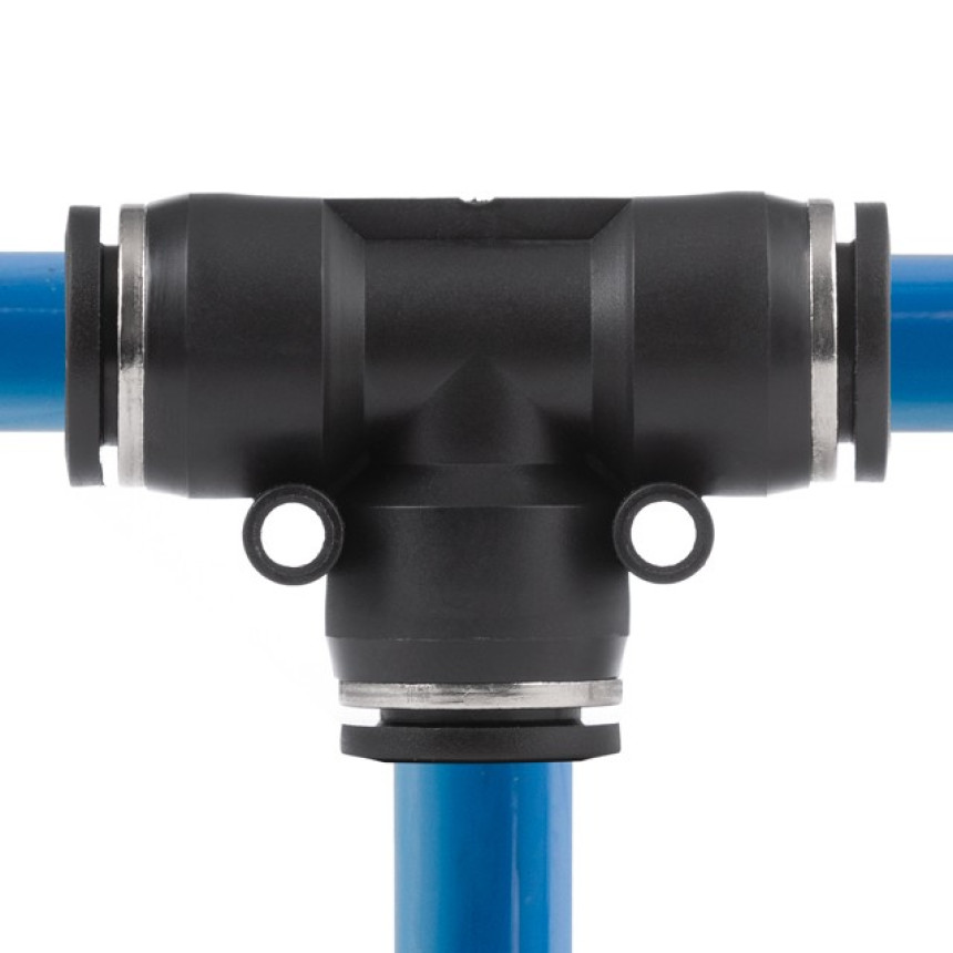 Призначення Цангове з'єднання T-подібної форми використовується для створення пневматичних магістралей і для монтажу пневмосистем. Забезпечує повністю герметичне з'єднання різних пневматичних шлангів без пошкодження їхньої поверхні (PU, PE, PA..Детальніше