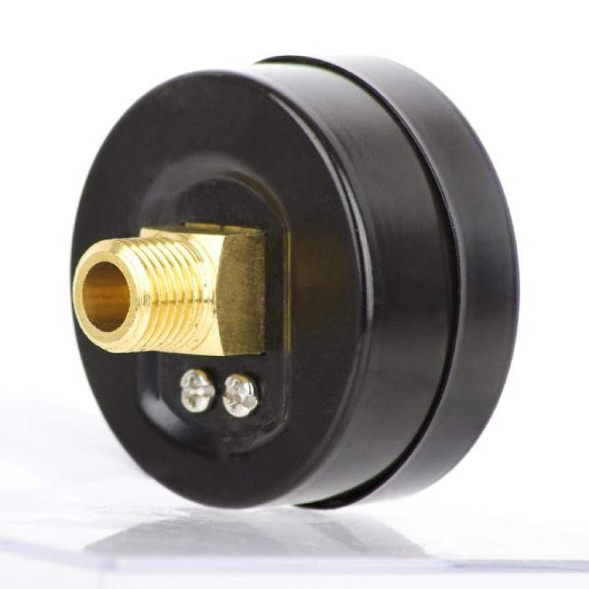 Корпус манометра виконаний з металу, штуцер знаходиться ззаду (осьовий). Такий манометр встановлюють на будь-які блоки підготовки повітря та фільтри з діаметром різьби 1/4".