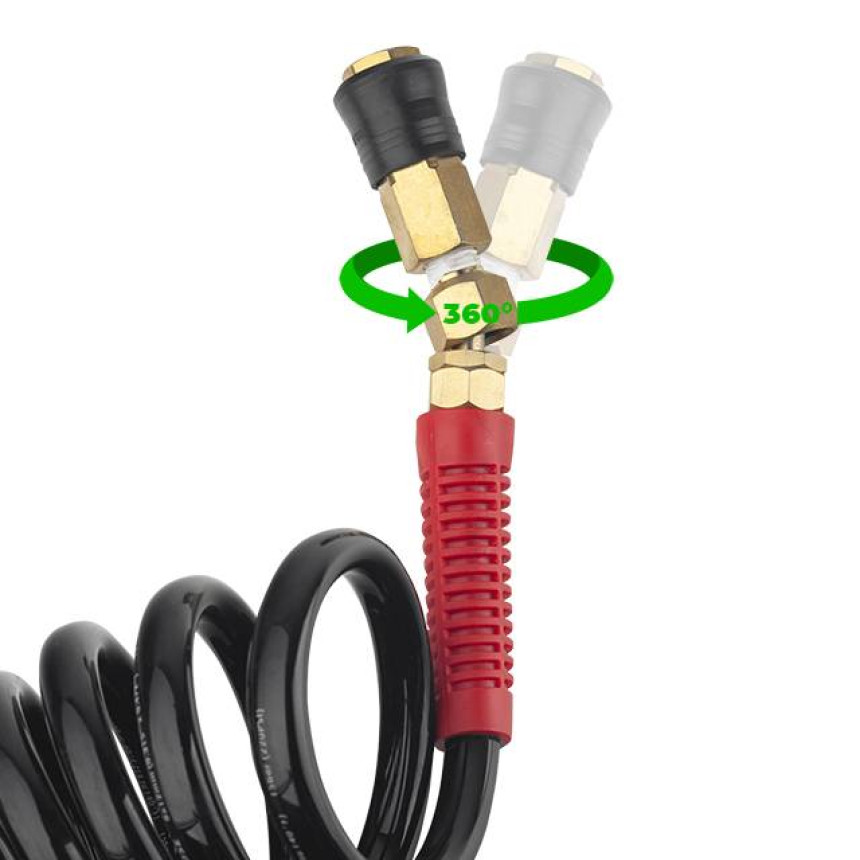 Один кінець шланга оснащений шарніром, що обертається на 360 градусів, для більшої мобільності та максимальної зручності оператора, він знімає навантаження з рук та унеможливлює заламування шланга. Забезпечує стабільне з'єднання обладнання із джерелом повітря.