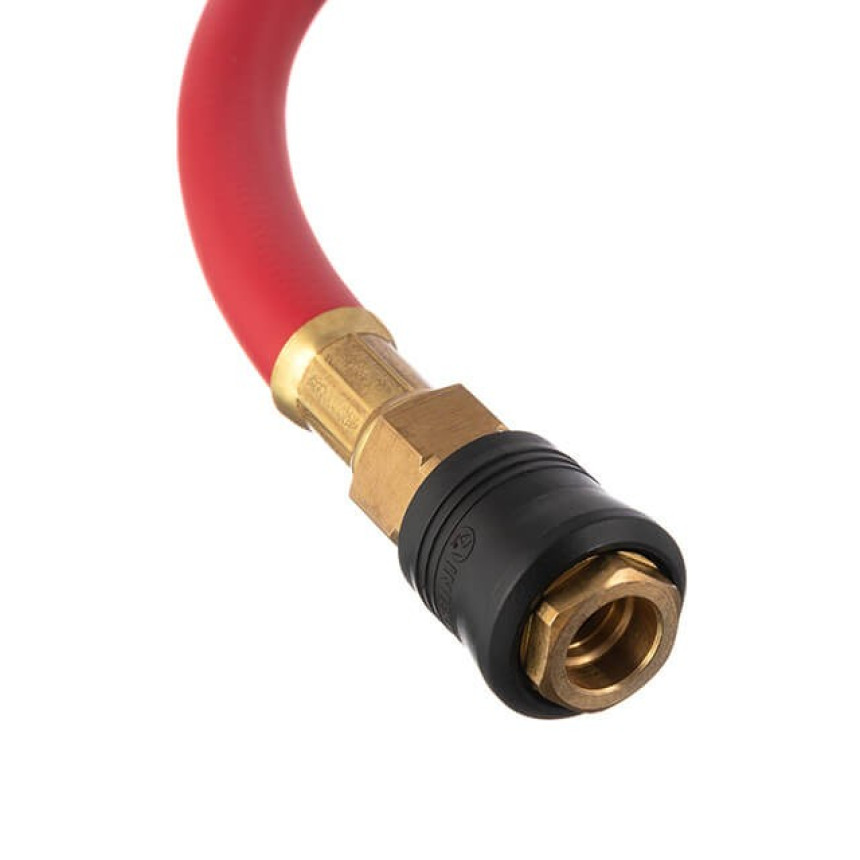 Шланг легко підключається до системи за допомогою швидкороз'ємних з'єднань європейського типу, вони герметичні та дозволяють швидко під’єднати пневмоінструмент до компресора. Виготовлені з'єднання з латуні, мають ряд переваг перед сталевими фітингами. Характеризуються підвищеною стійкістю до корозії, мають більший термін експлуатації, довговічніші.