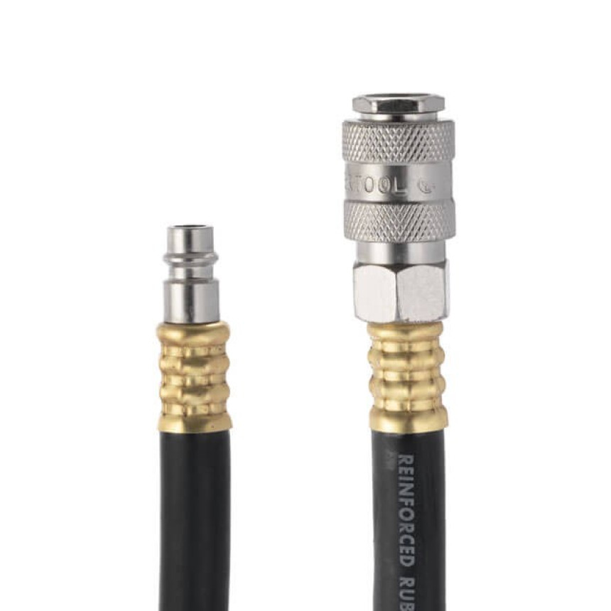 Шланг підключається до системи за допомогою швидкороз'ємних з'єднань європейського типу, вони герметичні та дозволяють швидко під’єднати пневмоінструмент до компресора.