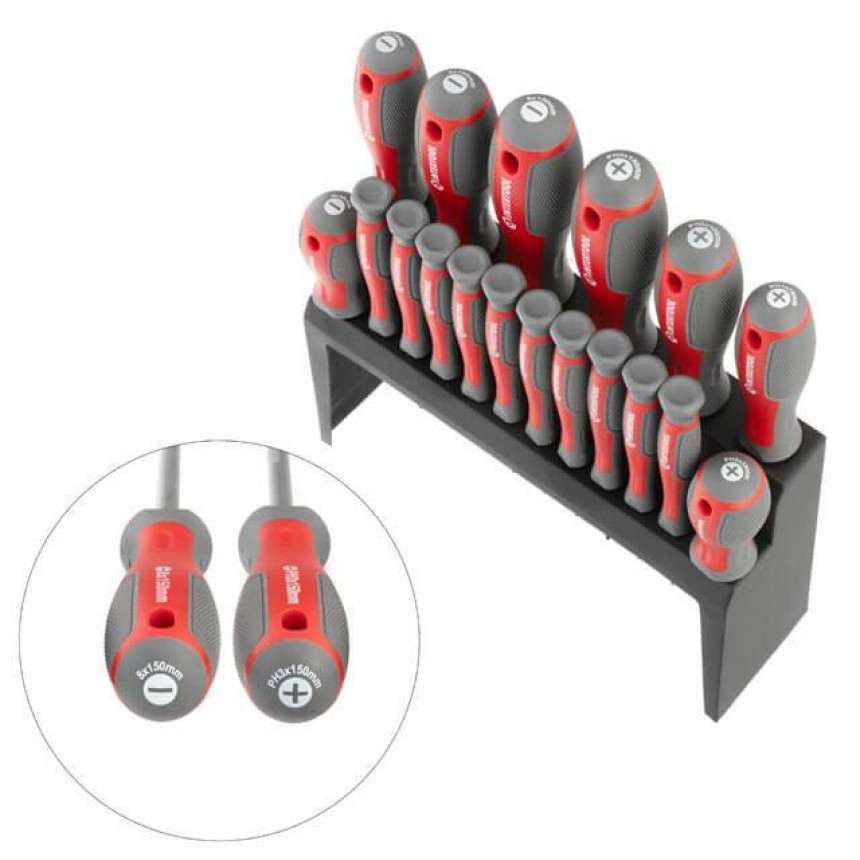 Викрутки укомплектовані в спеціальний тримач для зберігання. Ви можете поставити набір на будь-який стіл чи полицю, а також підвісити на стіну (передбачені отвори для кріплення).