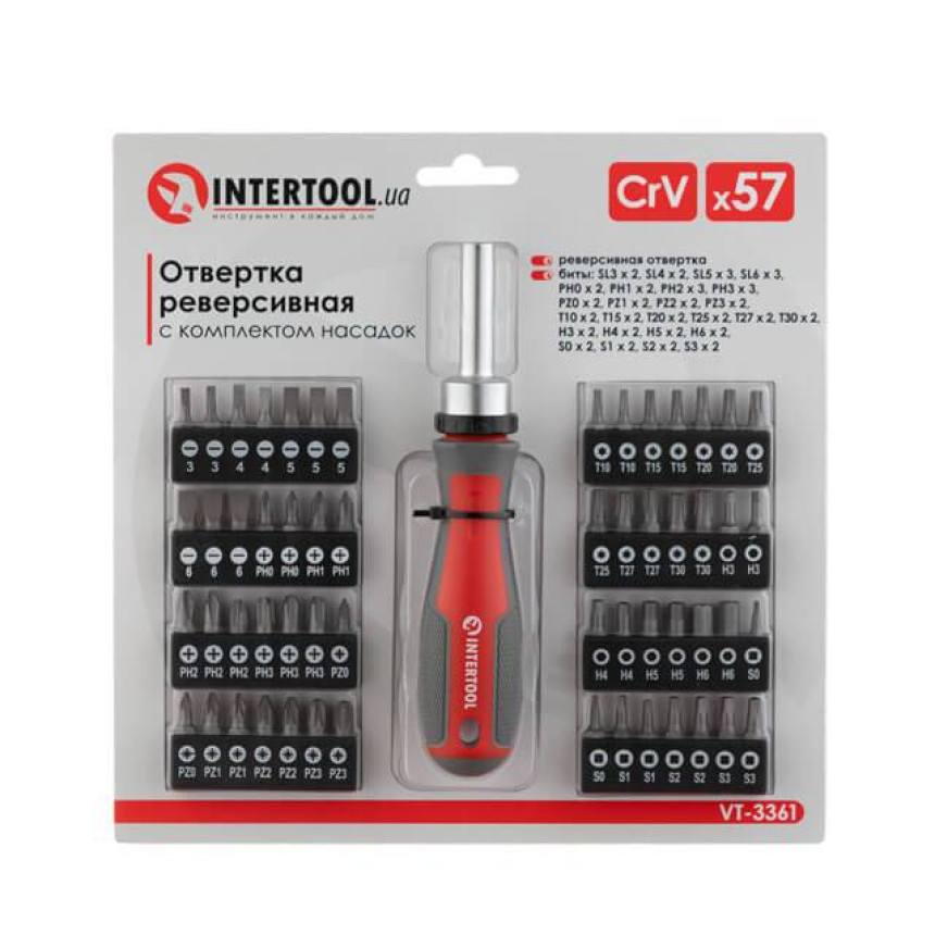 Викрутка INTERTOOL VT-3361 з комплектом насадок виготовлена за останніми технологіями і відповідає вибагливим запитам майстрів. Призначена для монтажу та демонтажу різьбових з'єднань різних типів. Така реверсивна викрутка стане відмінним помічником в домашньому арсеналі інструменту, а також в персональній майстерні, на виробництві.
