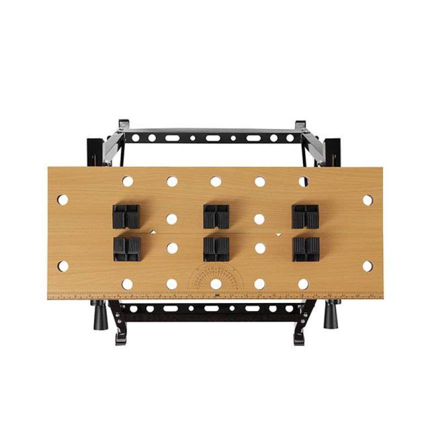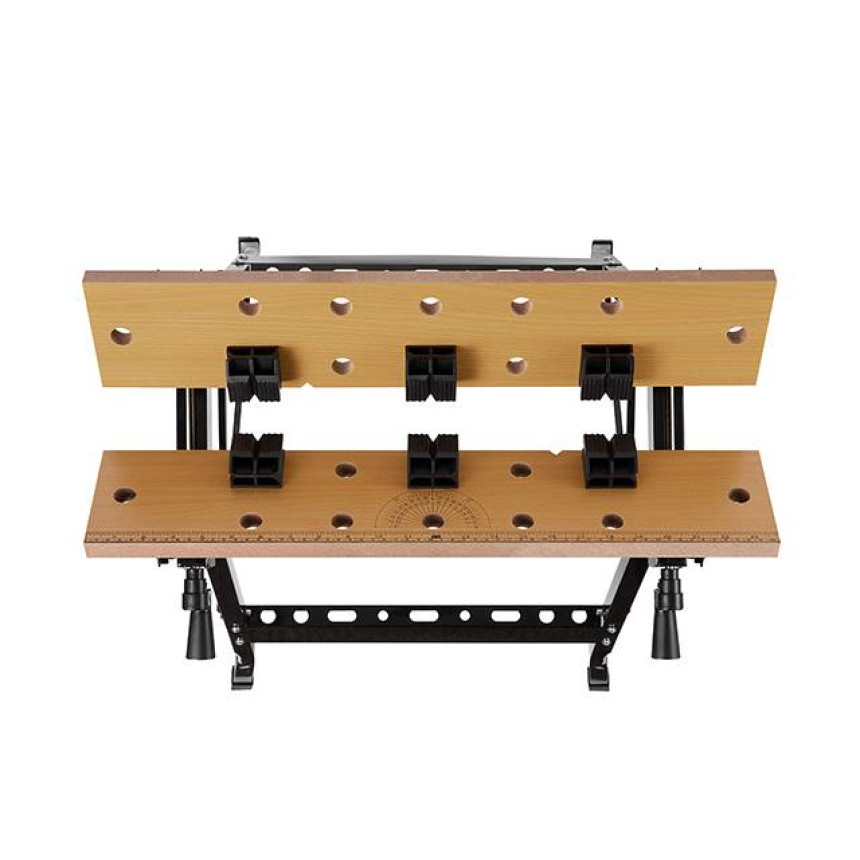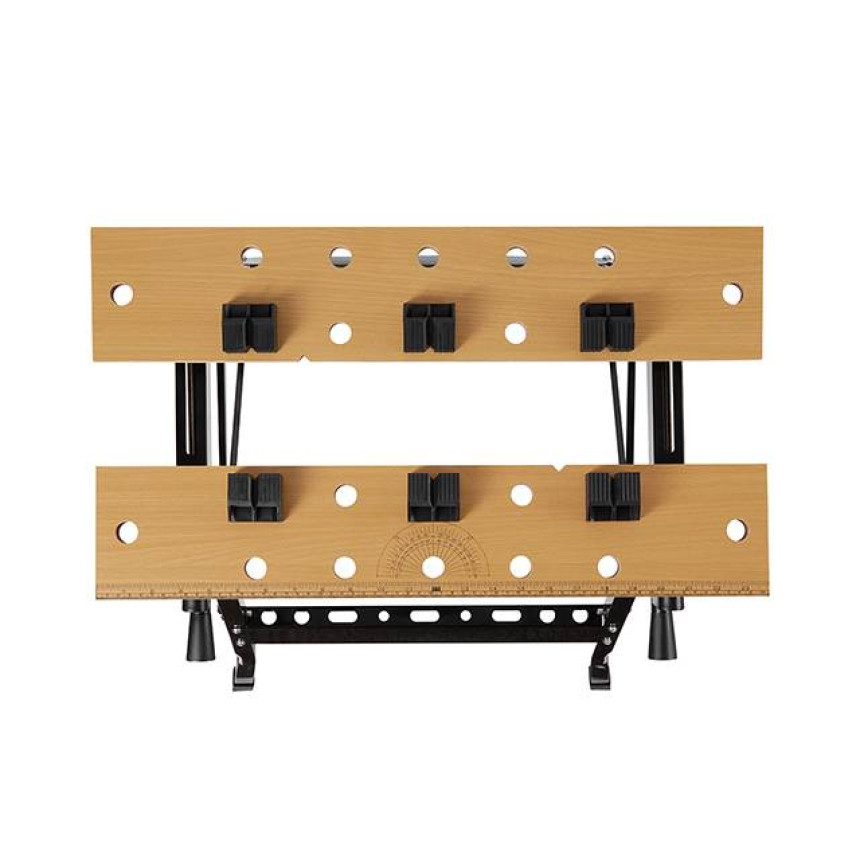 Отвори у стільниці, а також знімні пластикові упори служать для стискання та фіксації заготовок. Додатково верстат оснащений лінійкою та транспортиром для точних вимірювань у процесі роботи.