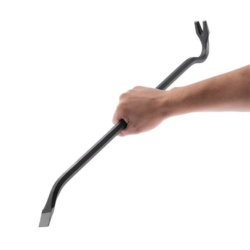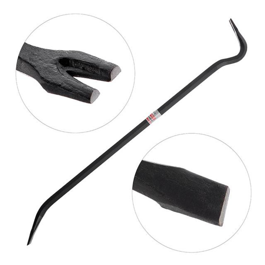 Виготовлений із високоміцної загартованої інструментальної сталі для виконання складних демонтажних робіт. Кутовий цвяходер створює опору з високим важелем для зачеплення або підйому, а загострений кінець лома вклинюється у важкодоступні місця. Плоска поверхня цвяходера дозволяє вбивати лом за допомогою молотка.