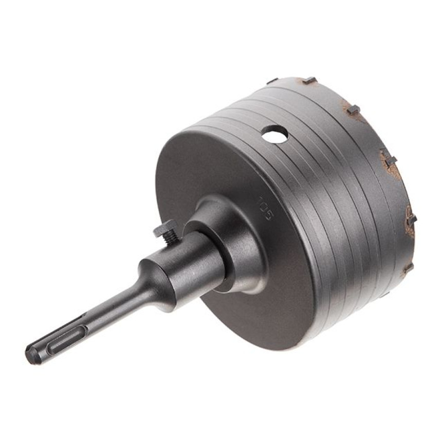Коронка Ø105 мм оснащена твердосплавними зубами у кількості 12 шт. Завдяки такій конструкції має високу стійкість до зносу та довго зберігає свою гостроту. Твердосплавні зубці мають високу твердість HRC 90, легко проникають у тверді матеріали, забезпечуючи більш ефективне та швидке буріння.