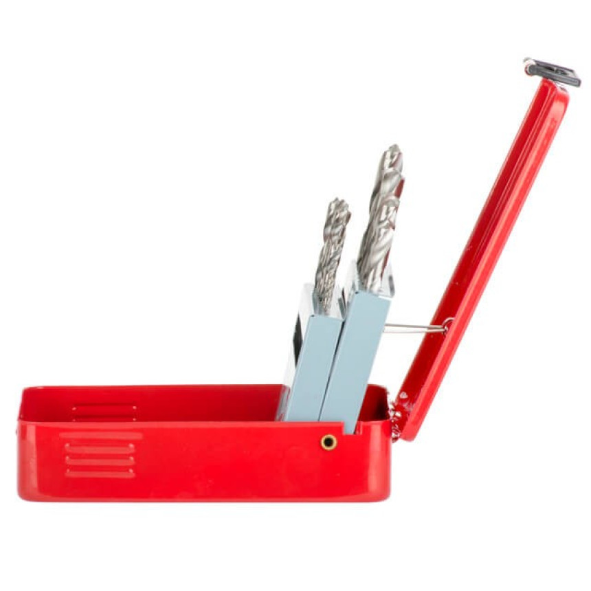 Все завжди на своїх місцях і не розсипаються при транспортуванні, оскільки набір поставляється в зручній металевій коробці. Маркування під кожним свердлом дозволяє швидко вибрати необхідний діаметр.
