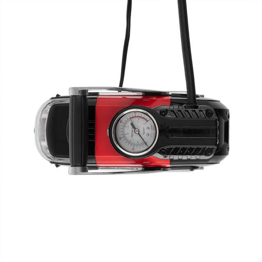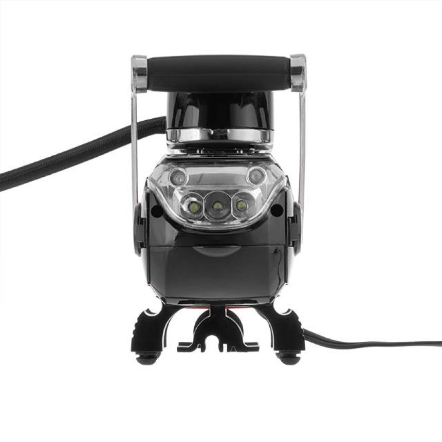 Компресор має дуже скромні габарити, тому разом із комплектом та сумкою поміститися навіть у невеликих багажниках. Живлення здійснюється від прикурювача автомобіля 12 В, тому ви зможете легко накачати колесо в дорозі. Довжина мережевого дроту 3 метри. Вбудований LED-ліхтар допоможе зручно накачати колесо навіть у темну пору доби, працює як від прикурювача, так і від батарейок ААА типу.