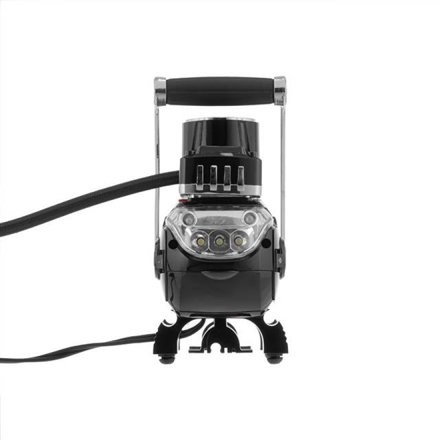 Компресор має дуже скромні габарити, тому разом із комплектом та сумкою поміститися навіть у невеликих багажниках. Живлення здійснюється від прикурювача автомобіля 12 В, тому ви зможете легко накачати колесо в дорозі. Довжина мережевого дроту 3 метри.