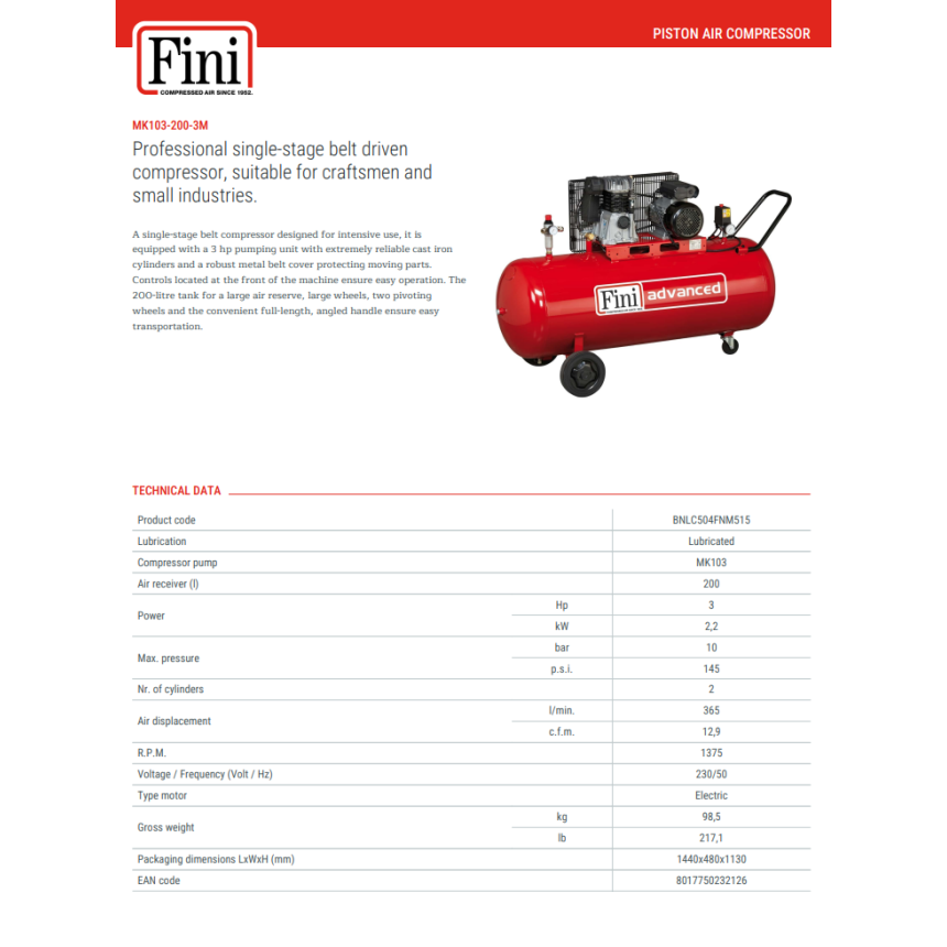 Якщо вам потрібен мобільний, потужний та довговічний компресор для різних завдань, Fini MK103-200-3M — ваш ідеальний вибір!