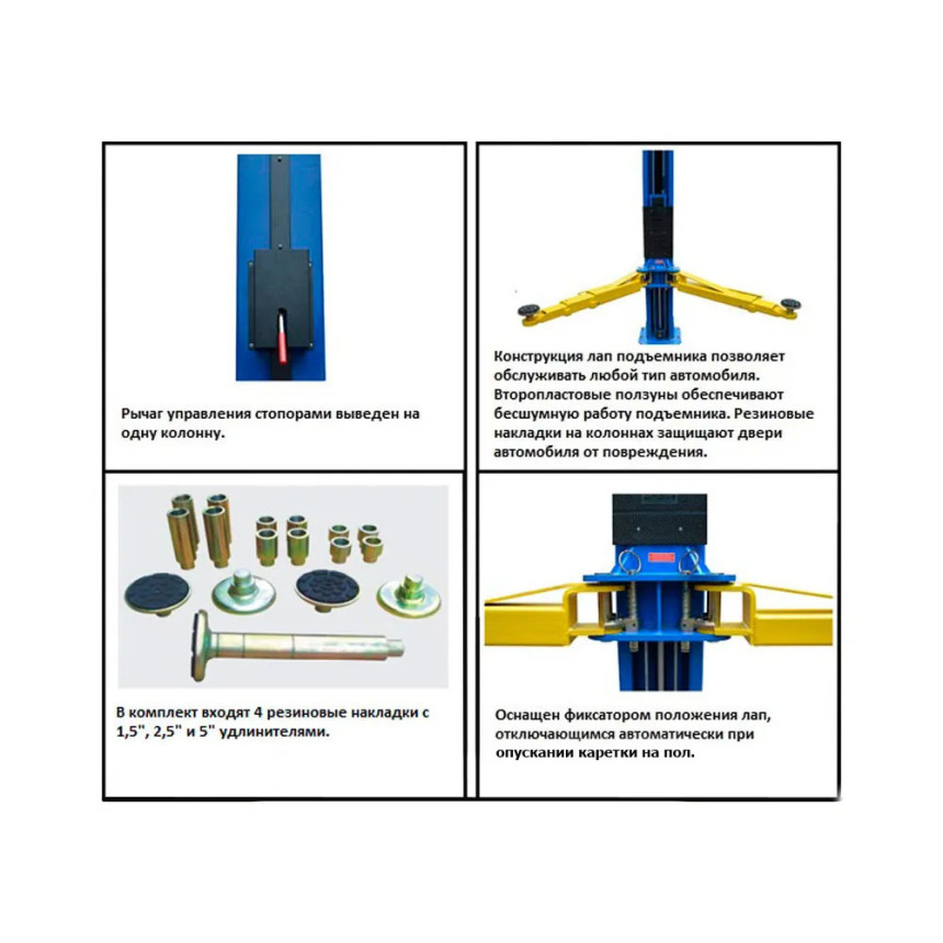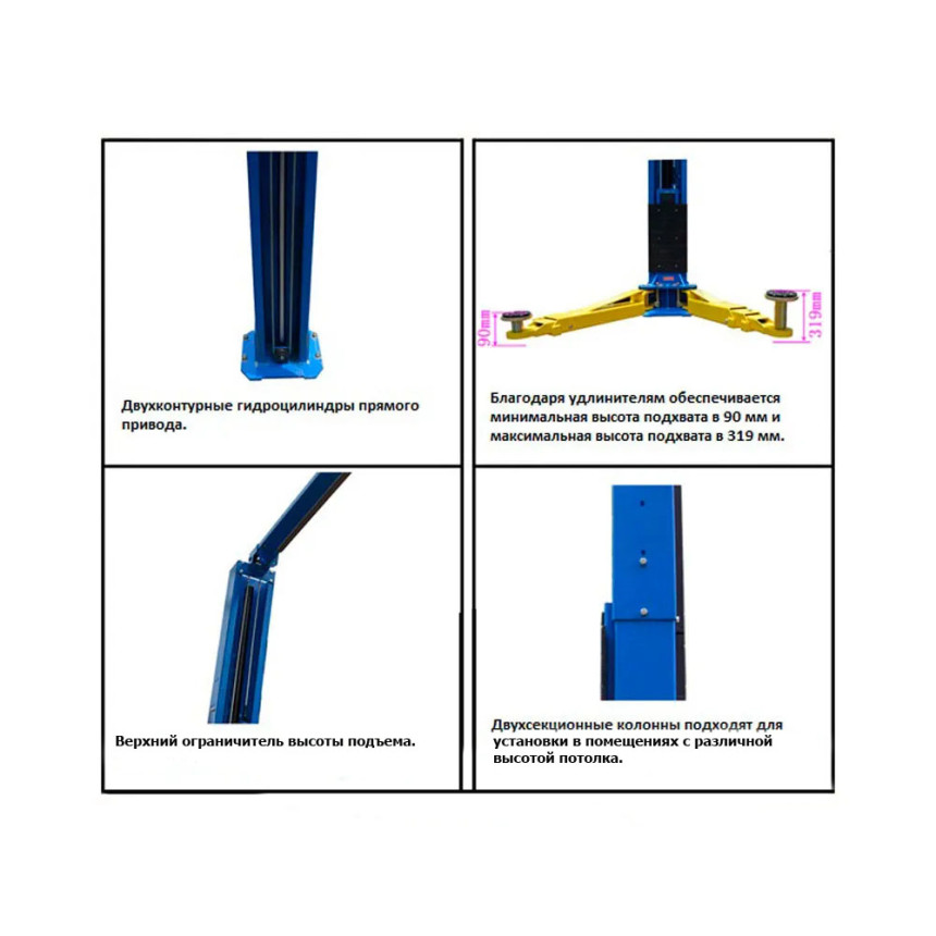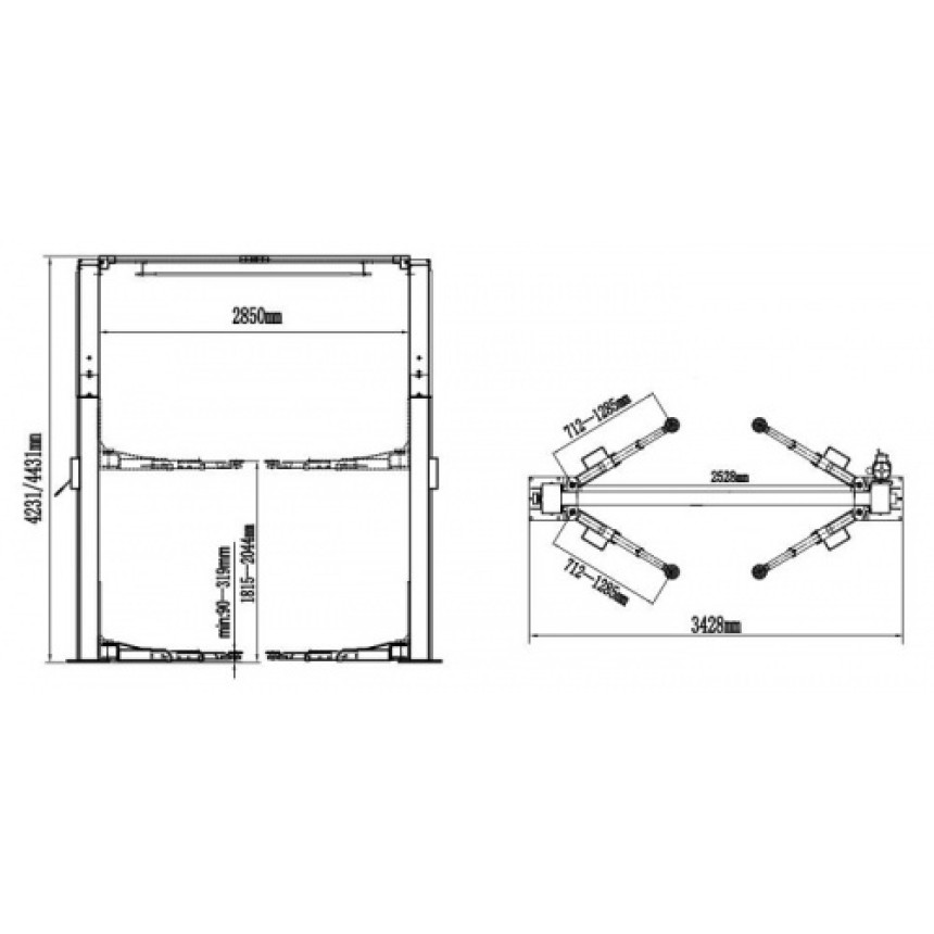 Грузоподъемность 4.0T Время подъема 52 секунды Высота подъема 1815-2044 мм Общая высота 4231/4431 мм Общая ширина 3428 мм Ширина сквозного проезда 2528 мм Ширина между колоннами 2850 мм Минимальная высота подушки 90 мм Двигатель 2.2 Кв