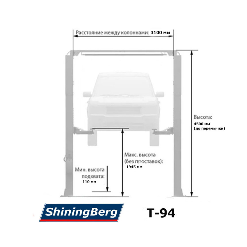 Грузоподъемность - 6,0 т Высота до перемычки 4500 мм Длина передних лап 930 - 1900 мм Длина задних лап 930 - 1900 мм Высота подъем 1945 мм Время подъема/ опускания 45 сек Минимальная высота подхвата 110 мм Расстояние между стойками 3100 мм Мощность электродвигателя 1 х 3 кВт Электропитание 380 В/Гц Габаритна ширина-3800 мм