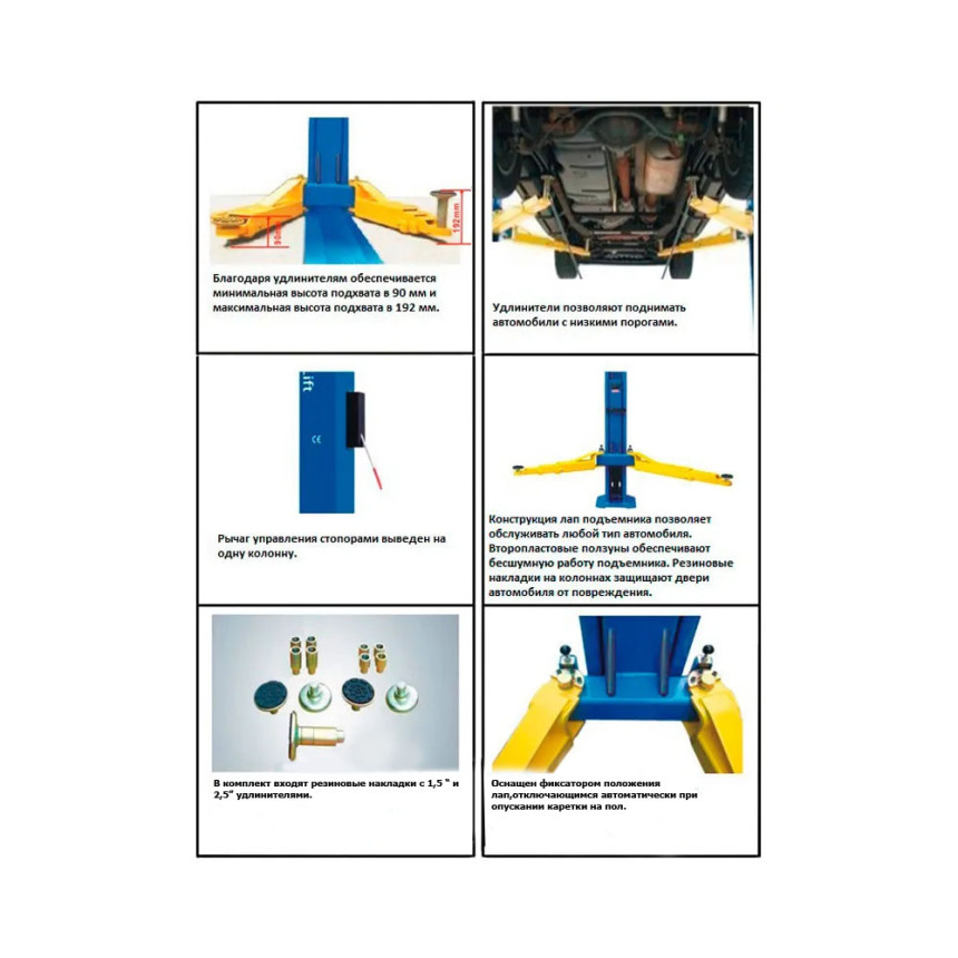 4 лапы - трех секционные, длина 683 -1159 мм Грузоподъемность 4 T Время подъема 45 секунд Высота подъема 1815-1917 мм Общая высота 2850 мм Общая ширина 3390 мм Ширина сквозного проезда 2554 мм Ширина между колоннами 2780 мм Минимальная высота подушки 90 мм Двигатель 2.2 Кв