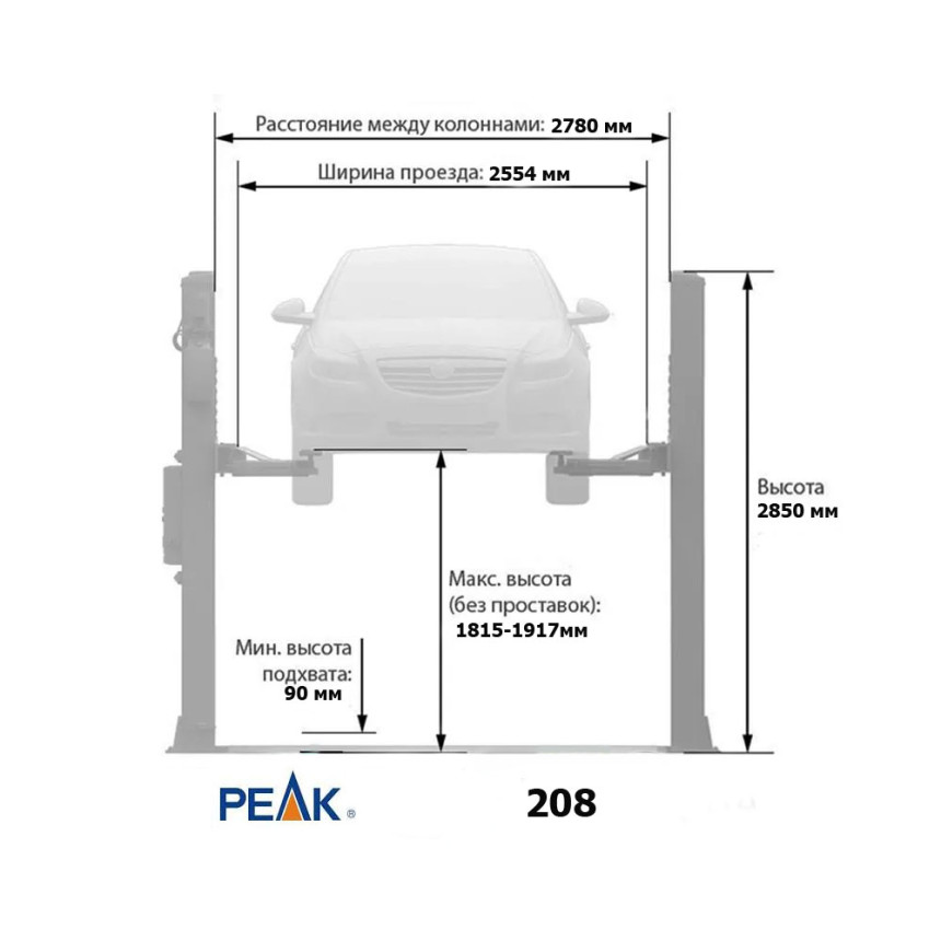 Peak 208 — двухстоечный электрогидравлический подъемник для легковых автомобилей, с нижней синхронизацией, с максимальной грузоподъемностью — 4000 кг и асимметричными лапами. Снятие со стопоров производится рычагом на колонне.