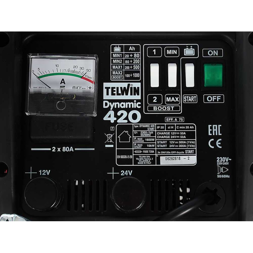 Telwin Dynamic 420 Start - це універсальний зарядно-пусковий пристрій, призначений для роботи з акумуляторами WET з напругою 12/24В. Пристрій ідеально підходить для заряджання та швидкого запуску автомобілів, фургонів та легких вантажівок, надаючи надійність та зручність експлуатації.